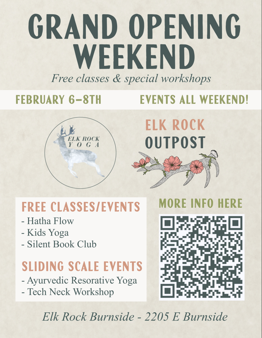 Join us February 6-8th for the Grand Opening of our 2nd Elk Rock Yoga Location nestled inside Elk Rock Outpost. Free classes and special workshops available all weekend!